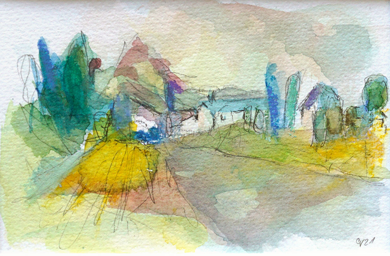 Landurlaub - semiabstrakte Landschaftszskizze - Mixed Media, Aquarell, Bleistift und Kreide auf Aquarellkarton - 2021 - 12 x 17cm